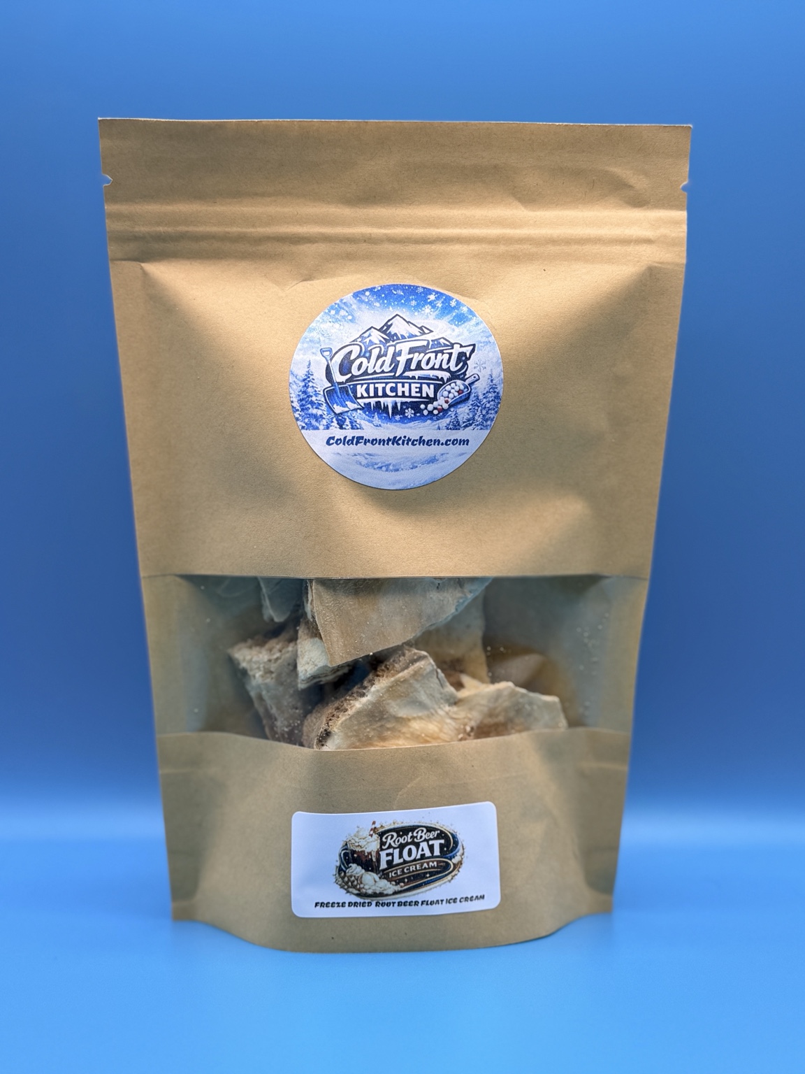 Freeze-dried ice cream bites made from real root beer float flavored ice cream, transformed into light, crunchy pieces that melt on contact.